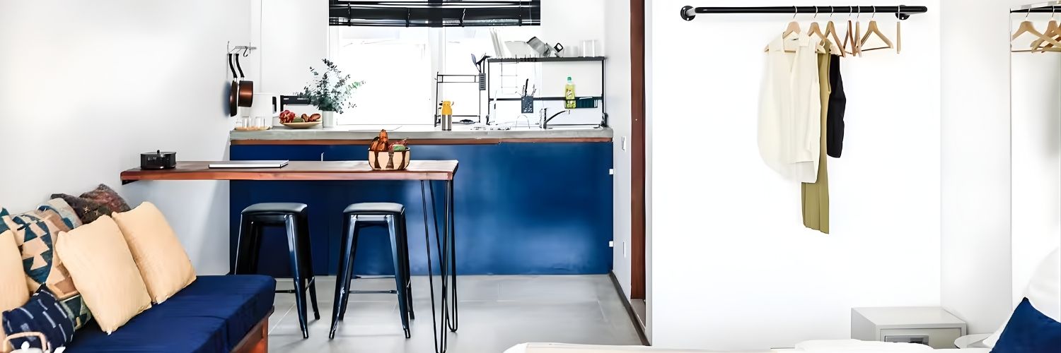 🛏️ Studio Apartment 🪑 Table for Working 🌬️ Air Conditioning 🚿 Private Bathroom 🍽️ Kitchenette 🛋️ Living Area 👗 Wardrobe Space 🏙️ City Location