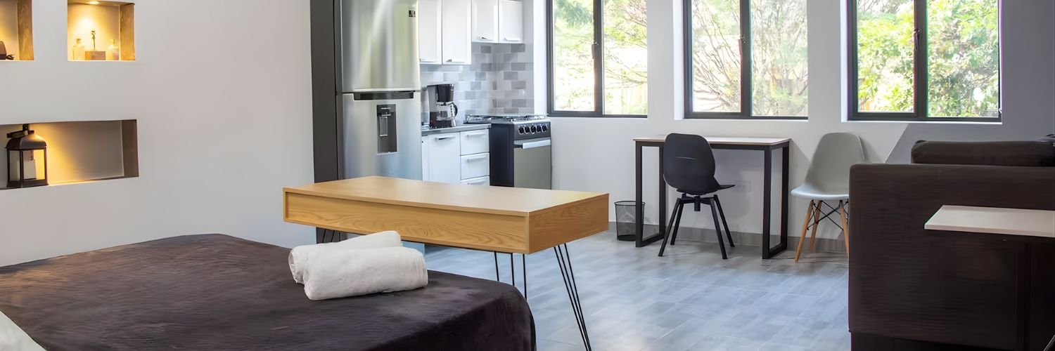 🛏️ Studio Apartment 🪑 Work Desk 🚿 Private Bathroom 🌬️ Air Conditioning 🍴 Kitchenette 🛋️ Living Area 🧺 Laundry Facilities 🚇 23-Minute Walk from El Poblado Metro Station 🏙️ City Location