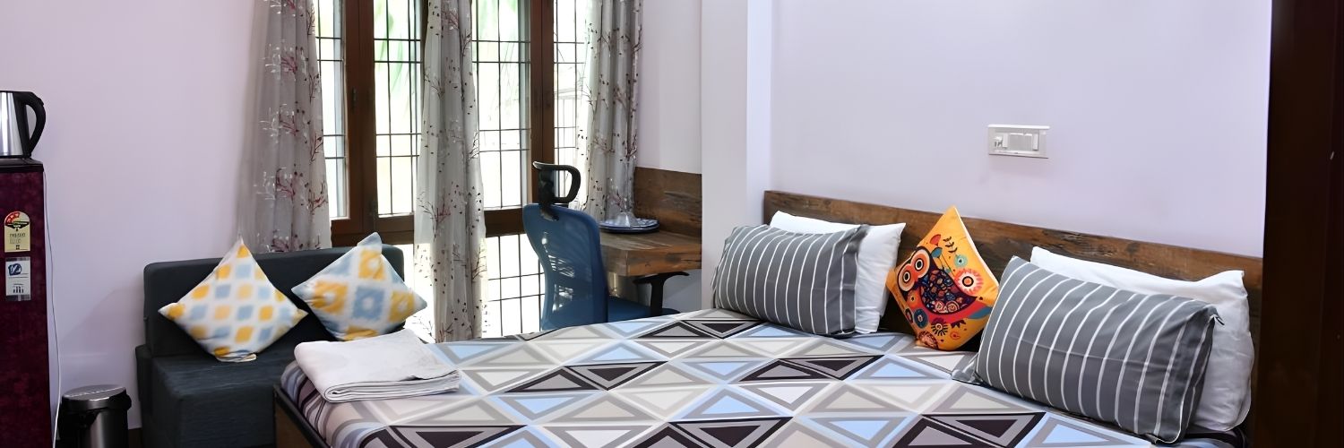 🛏️ One Room Type: Deluxe Double Room 🪑 Work Desk in Majority of Rooms 🌬️ Air Conditioning 🚿 Private Bathroom 🍽️ Shared Kitchen 🛋️ Shared Living Area 🧺 Laundry Facilities 🚆 0.8 Miles from Greater Kailash Station 🏙️ City Location